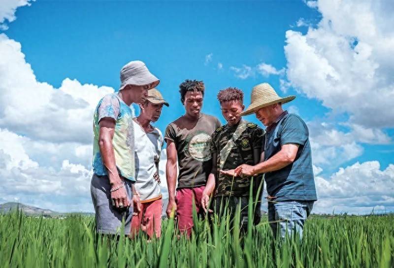 近年来,在中非合作论坛和共建“一带一路”倡议框架下,中国通过助力非洲基础设施建设、生产装备升级和产业链延伸,有效提升非洲农业生产效率和可持续发展能力,推动非洲实现农业现代化。图为2025年3月25日,在马达加斯加马希齐镇,中国农业专家向当地稻农介绍水稻生长情况。 新华社记者 李亚辉/摄